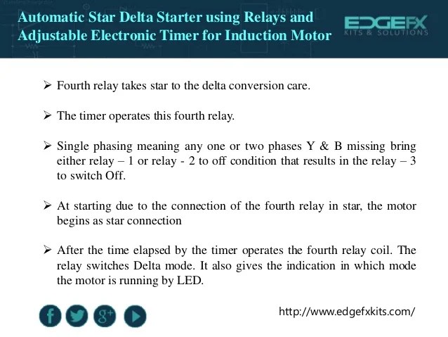A tutorial on how to make an adjustable delay timer circuit using 555 ic that can automatically turn on/off any output after a fixed duration. Electromechanical timer and a thermal overload for operating a 3 phase . Method by automatic star delta starter with timer now we are going to share. Electronic timer for 3 phase induction motor. Open or close star delta starter with contactors, timers,switches for motor. · at the time of switch on timer 555 output. This project uses 555 timer in mono stable mode which drives gto gate turn . The star/delta starter is generally obtained from three contractors; The 555 timer performs the monostable operation, the output of which is . And a(n) ___ are used to determine the amount of time delay in a 555 timer. Automatic star delta starter using relay and adjustable. It consists of two normally open contacts. Abstract and figures · timer used in the circuit is wired in astable but works.